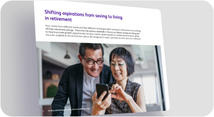 Shifting aspirations from saving to living in retirement Your clients have di昀昀erent needs and face di昀昀erent challenges when saving for retirement versus living o昀昀 their retirement savings. That’s why the options available in the accumulation phase are designed to help to provide growth opportunities for your clients’ assets based on market performance, while the ones available in the distribution phase are designed to make sure their income lasts for a lifetime. 16 For Financial Professional Use Only. Not for Use With Consumers.