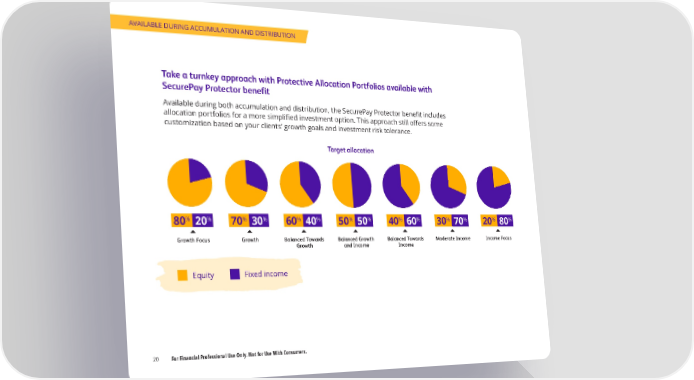 AVAILABLE DURING ACCUMULATION AND DISTRIBUTION Take a turnkey approach with Protective Allocation Portfolios available with SecurePay Protector benefit Available during both accumulation and distribution, the SecurePay Protector benefit includes allocation portfolios for a more simplified investment option. This approach still offers some customization based on your clients’ growth goals and investment risk tolerance. Target allocation % % % % % % % % % % % % % % 80 20 70 30 60 40 50 50 40 60 30 70 20 80 Growth Focus Growth Balanced Towards Balanced Growth Balanced Towards Moderate Income Income Focus Growth and Income Income Equity Fixed income 20 For Financial Professional Use Only. Not for Use With Consumers.