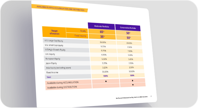 AVAILABLE DURING ACCUMULATION AND DISTRIBUTION Moderate Portfolio Conservative Portfolio % % Target Equity 65 50 allocation % % Fixed income 35 50 U.S. Large Cap Equity 26.00% 20.00% U.S. Small Cap Equity 9.75% 7.50% U.S.High Growth Equity 9.75% 7.50% U.K. Equity 6.50% 5.00% European Equity 6.50% 5.00% Japan Equity 3.25% 2.50% Asia Equity (excluding Japan) 3.25% 2.50% Fixed Income 35.00% 50.00% Total 100% 100% Available during ACCUMULATION Available during DISTRIBUTION For Financial Professional Use Only. Not for Use With Consumers. 23