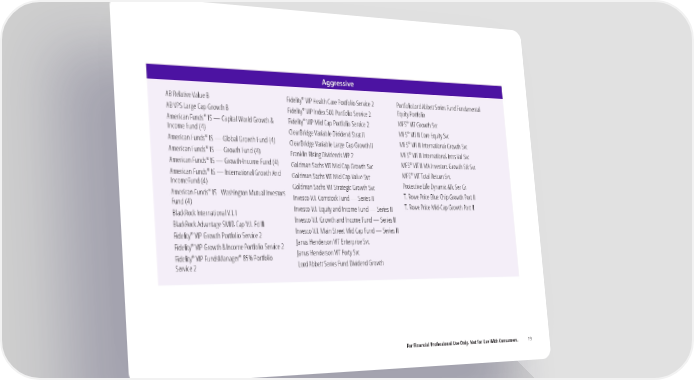 Aggressive ® AB Relative Value B Fidelity VIP Health Care Portfolio Service 2 PortfolioLord Abbett Series Fund Fundamental ® Equity Portfolio AB VPS Large Cap Growth B Fidelity VIP Index 500 Portfolio Service 2 ® ® ® American Funds IS — Capital World Growth & Fidelity VIP Mid Cap Portfolio Service 2 MFS VIT Growth Svc ® Income Fund (4) ClearBridge Variable Dividend Strat II MFS VIT II Core Equity Svc ® ® American Funds IS — Global Growth Fund (4) ClearBridge Variable Large Cap Growth II MFS VIT II International Growth Svc ® ® American Funds IS — Growth Fund (4) Franklin Rising Dividends VIP 2 MFS VIT II International Intrs Val Svc ® ® American Funds IS — Growth-Income Fund (4) Goldman Sachs VIT Mid Cap Growth Svc MFS VIT II MA Investors Growth Stk Svc ® ® American Funds IS — International Growth And Goldman Sachs VIT Mid Cap Value Svc MFS VIT Total Return Svc IncomeFund (4) Goldman Sachs VIT Strategic Growth Svc Protective Life Dynamic Allc Ser Gr ® American Funds IS - Washington Mutual Investors Invesco V.I. Comstock Fund — Series II T. Rowe Price Blue Chip Growth Port II Fund (4) Invesco V.I. Equity and Income Fund — Series II T. Rowe Price Mid-Cap Growth Port II BlackRock International V.I. I Invesco V.I. Growth and Income Fund — Series II BlackRock Advantage SMID Cap V.I. Fd III Invesco V.I. Main Street Mid Cap Fund — Series II ® Fidelity VIP Growth Portfolio Service 2 Janus Henderson VIT Enterprise Svc ® Fidelity VIP Growth & Income Portfolio Service 2 Janus Henderson VIT Forty Svc ® ® Fidelity VIP FundsManager 85% Portfolio Lord Abbett Series Fund Dividend Growth Service 2 For Financial Professional Use Only. Not for Use With Consumers. 19