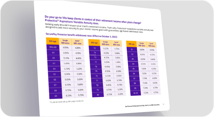 Do your go-to VAs keep clients in control of their retirement income when plans change? ® Protective Aspirations Variable Annuity does. Retiring early shouldn’t impact your client’s retirement income. That’s why Protective® Aspirations variable annuity was designed to add more security to your clients’ income goals with guaranteed, age-based withdrawal rates. SecurePay Protector benefit withdrawal rates (Effective October 3, 2022) WD age Single Joint* WD age Single Joint* WD age Single Joint* WD rates WD rates WD rates WD rates WD rates WD rates 70 6.25% 5.75% 81 6.80% 6.30% 59½-60 4.50% 4.00% 71 6.30% 5.80% 82 6.85% 6.35% 61 4.80% 4.30% 72 6.35% 5.85% 83 6.90% 6.40% 62 5.10% 4.60% 73 6.40% 5.90% 84 6.95% 6.45% 63 5.40% 4.90% 74 6.45% 5.95% 85 7.00% 6.50% 64 5.70% 5.20% 75 6.50% 6.00% 86 7.05% 6.55% 65 6.00% 5.50% 76 6.55% 6.05% 87 7.10% 6.60% 66 6.05% 5.55% 77 6.60% 6.10% 88 7.15% 6.65% 67 6.10% 5.60% 78 6.65% 6.15% 89 7.20% 6.70% 68 6.15% 5.65% 79 6.70% 6.20% 90-95 7.25% 6.75% 69 6.20% 5.70% 80 6.75% 6.25% *The joint rate is based on the age of the younger covered person. For Financial Professional Use Only. Not for Use With Consumers. 13