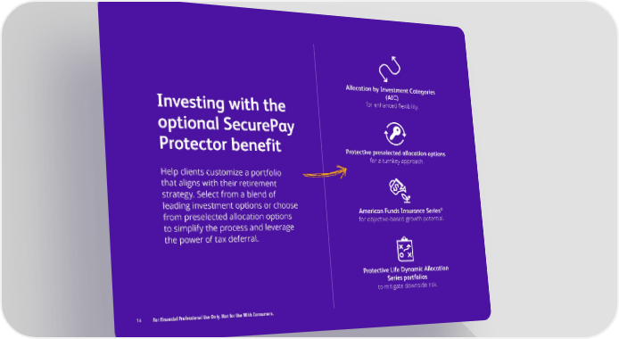 Allocation by Investment Categories (AIC) Investing with the for enhanced flexibility. optional SecurePay Protector benefit Protective preselected allocation options for a turnkey approach. Help clients customize a portfolio that aligns with their retirement strategy. Select from a blend of leading investment options or choose ® from preselected allocation options American Funds Insurance Series to simplify the process and leverage for objective-based growth potential. the power of tax deferral. Protective Life Dynamic Allocation Series portfolios to mitigate downside risk. 14 For Financial Professional Use Only. Not for Use With Consumers.