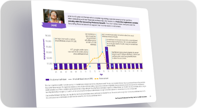Jane is a 65-year-old female who’s considering adding a variable annuity to her portfolio. After consulting with her financial professional, she invests in a Protective Aspirations variable annuity with the SecurePay Protector benefit. The chart below shows how Jane used the SecurePay Reserve benefit to support her income needs in retirement. JANE Jane now decides to Jane's reserved amount reaches the maximum value (3x her annual $60,000 take a trip and help withdrawal amount) of $36,000. Jane begins income with a maximum her grandchildren Jane withdraws the full reserve amount (3x her annual withdrawal annual withdrawal amount of $12,000. with college expenses amount) using SecurePay Reserve. She is also able to withdrawal $50,000 and takes a $12,000 her current year's benefit of $12,000, making her total withdrawal withdrawal. amount $48,000. $40,000 At 72, Jane gains another income Now that Jane’s reserve amount is depleted, she can start $30,000 source and decides to defer all of her taking her usual $12,000/year withdrawals, or take less and annual withdrawal amount. continue to defer funds by using SecurePay Reserve Withdrawal amount$20,000 to rollover the excess income. $10,000 $0 65 66 67 68 69 70 71 72 73 74 75 76 77 78 79 80 81 82 83 84 Age Actual amount withdrawn Annual withdrawal amount (AWA) Reserve amount This chart is hypothetical and for illustrative use only. It is intended solely to demonstrate the SecurePay Reserve benefit. The chart is not intended to forecast, imply or guarantee performance of any investment. Actual performance may vary. This hypothetical example assumes a 65 year-old female makes a single premium investment of $200,000 in Protective Aspirations variable annuity with the SecurePay Protector benefit selected at issue. There is no deferral period and she elects to begin taking her SecurePay Protector withdrawals at age 65 at a 6.00% withdrawal rate. She defers her annual withdrawal amount using the SecurePay Reserve feature at ages 72, 73, and 75 until her account reaches the maximum deferred amount. At age 76 she elects to take her full reserved amount plus her current year AWA. Once benefit withdrawals have begun, you may take less than the annual withdrawal amount and reserve the remainder for later. The reserve can be no larger than: 1) 3x the annual withdrawal amount or 2) the current account value. Withdrawals are taken from the reserve first, then the annual withdrawal amount. For Financial Professional Use Only. Not for Use With Consumers. 29