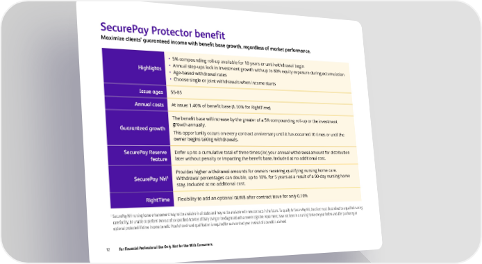 SecurePay Protector benefit Maximize clients’ guaranteed income with benefit base growth, regardless of market performance. • 5% compounding roll-up available for 10 years or until withdrawal begin Highlights • Annual step-ups lock in investment growth with up to 80% equity exposure during accumulation • Age-based withdrawal rates • Choose single or joint withdrawals when income starts Issue ages 55-85 Annual costs At issue: 1.40% of benefit base (1.50% for RightTime) The benefit base will increase by the greater of a 5% compounding roll-up or the investment Guaranteed growth growth annually. This opportunity occurs on every contract anniversary until it has occurred 10 times or until the owner begins taking withdrawals. SecurePay Reserve Defer up to a cumulative total of three times (3x) your annual withdrawal amount for distribution feature later without penalty or impacting the benefit base. Included at no additional cost. Provides higher withdrawal amounts for owners receiving qualifying nursing home care. 1 Withdrawal percentages can double, up to 10%, for 5 years as a result of a 90-day nursing home SecurePay NH stay. Included at no additional cost. RightTime Flexibility to add an optional GLWB after contract issue for only 0.10% 1 SecurePay NH nursing home enhancement may not be available in all states and may not be available with new contracts in the future. To qualify for SecurePay NH, the client must: Be confined to a qualified nursing care facility; be unable to perform two out of six specified Activities of Daily Living or be diagnosed with a severe cognitive impairment; have not been in a nursing home one year before and after purchasing an optional protected lifetime income benefit. Proof of continued qualification is required for each contract year in which this benefit is claimed. 12 For Financial Professional Use Only. Not for Use With Consumers.