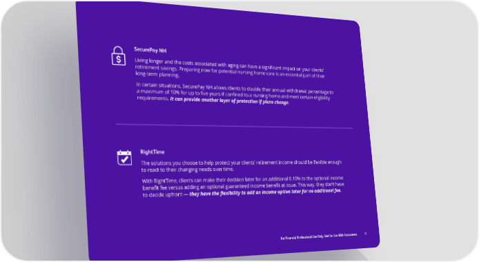 SecurePay NH Living longer and the costs associated with aging can have a significant impact on your clients’ retirement savings. Preparing now for potential nursing home care is an essential part of their long-term planning. In certain situations, SecurePay NH allows clients to double their annual withdrawal percentage to a maximum of 10% for up to five years if confined to a nursing home and meet certain eligibility requirements. It can provide another layer of protection if plans change. RightTime The solutions you choose to help protect your clients’ retirement income should be flexible enough to react to their changing needs over time. With RightTime, clients can make their decision later for an additional 0.10% to the optional income benefit fee versus adding an optional guaranteed income benefit at issue. This way, they don’t have to decide upfront — they have the flexibility to add an income option later for no additional fee. For Financial Professional Use Only. Not for Use With Consumers. 31