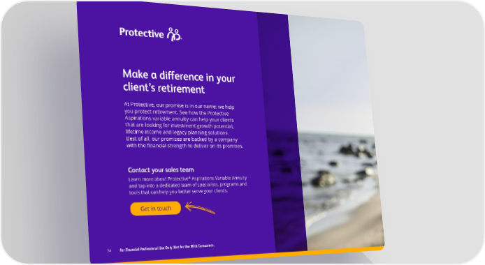 Make a difference in your client’s retirement At Protective, our promise is in our name: we help you protect retirement. See how the Protective Aspirations variable annuity can help your clients that are looking for investment growth potential, lifetime income and legacy planning solutions. Best of all, our promises are backed by a company with the financial strength to deliver on its promises. Contact your sales team ® Learn more about Protective Aspirations Variable Annuity and tap into a dedicated team of specialists, programs and tools that can help you better serve your clients. Get in touch 34 For Financial Professional Use Only. Not for Use With Consumers.