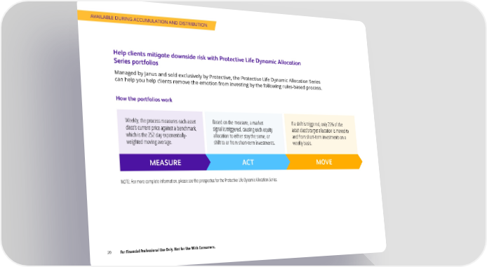 AVAILABLE DURING ACCUMULATION AND DISTRIBUTION Help clients mitigate downside risk with Protective Life Dynamic Allocation Series portfolios Managed by Janus and sold exclusively by Protective, the Protective Life Dynamic Allocation Series can help you help clients remove the emotion from investing by the following rules-based process. How the portfolios work Weekly, the process measures each asset Based on the measure, a market If a shift is triggered, only 25% of the class’s current price against a benchmark, signal is triggered, causing each equity asset class’s target allocation is moved to which is the 252 day exponentially- allocation to either stay the same, or and from short-term investments on a weighted moving average. shift to or from short-term investments. weekly basis. MEASURE ACT MOVE NOTE: For more complete information, please see the prospectus for the Protective Life Dynamic Allocation Series. 20 For Financial Professional Use Only. Not for Use With Consumers.