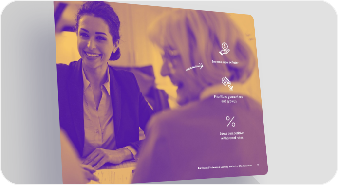 Aspirations_Digital_Kit_2023 Page 10 Page 12Income now or later Prioritizes guarantees and growth Seeks competitive withdrawal rates For Financial Professional Use Only. Not for Use With Consumers. 11