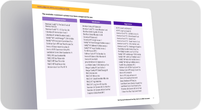 AVAILABLE DURING ACCUMULATION The available investment options have been categorized for you: Conservative Moderate Aggressive ® American Funds IS-The Bond Fund of American Century VP Balanced I AB VPS Growth and Income B America Fund (4) ® American Funds IS - Asset Allocation Fund AB VPS Large Cap Growth B ® ® American Funds IS - US Gov Secs Fd BlackRock 60/40 Trgt Allc ETF VI III American Funds IS - Cptl Wld Gr & Inc Fd Columbia VP Intermediate Bond 2 ® BlackRock Global Allocation V.I. III American Funds IS - Global Growth Fund Columbia VP Limited Duration Credit 2 ® Columbia VP Balanced 2 American Funds IS - Growth Fund ® ® ® Fidelity VIP FundsManager 20% Portfolio Columbia VP Strategic Income 2 American Funds IS - Growth-Income Fund ® ® ® Fidelity VIP Investment Grade Bond Port Fidelity VIP Asset Manager Portfolio Service 2 American Funds IS - Intl Gr And Inc Fund Goldman Sachs VIT Core Fixed Income Svc ® ® Fidelity VIP Balanced Portfolio Service 2 American Funds IS - Washington Mutual Inv Invesco VI Government Securities II ® Fidelity VIP Target Volatility Service 2 ClearBridge Variable Dividend Strat Port Invesco VI US Government Mny Ptf I Franklin Income VIP 2 ClearBridge Variable Large Cap Gr Port Lord Abbett Series Short Duration Inc Pt ® ® Goldman Sachs VIT Trd Driv Alloc Svc Fidelity VIP FundsManager 85% Portfolio PIMCO VIT Low Duration Adv ® Invesco VI Balanced-Risk Allocation II Fidelity VIP Health Care Portfolio Service 2 PIMCO VIT Real Return Adv ® Invesco VI Cnsrv Bal II Fidelity VIP Index 500 Portfolio Service 2 PIMCO VIT Short-Term Adv ® Janus Henderson VIT Balanced Svc Fidelity VIP Mid Cap Portfolio Service 2 PIMCO VIT Total Return Adv Lord Abbett Series Fd Bd Debenture Port Franklin Rising Dividends VIP 2 Western Asset Core Plus VIT II Morgan Stanley VIF Core Fxd Inc II Goldman Sachs VIT Mid Cap Growth Svc Morgan Stanley VIF Global Strategist II Goldman Sachs VIT Strategic Growth Svc PIMCO Income Adv Invesco VI Comstock II PIMCO VIT All Asset Adv Invesco VI Equity and Income II PIMCO VIT Global Diversified Alloc Adv Invesco VI Growth and Income II PIMCO VIT High Yield Adv Janus Henderson VIT Forty Svc PIMCO VIT Long-Term US Govt Adv Lord Abbett Series Dividend Growth Port Protective Life Dynamic Allc Ser ModPort Lord Abbett Series Fund Fdmtl Eq Port Protective Life Dynamic AllcSerCnsrvPort Protective Life Dynamic Allc Ser Gr Port Templeton Global Bond VIP 2 T. Rowe Price Blue Chip Growth Port II For Financial Professional Use Only. Not for Use With Consumers. 17