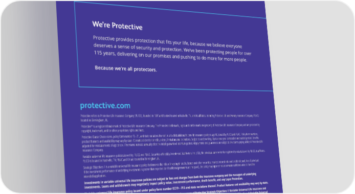 We’re Protective Protective provides protection that 昀椀ts your life, because we believe everyone deserves a sense of security and protection. We’ve been protecting people for over 115 years, delivering on our promises and pushing to do more for more people. Because we’re all protectors. protective.com Protective refers to Protective Life Insurance Company (PLICO), founded in 1907 and located located in Nashville, TN, and its a昀케liates, including Protective Life and Annuity Insurance Company (PLAIC) located in Birmingham, AL. Protective® is a registered trademark of Protective Life Insurance Company. The Protective trademarks, logos and service marks are property of Protective Life Insurance Company and are protected by copyright, trademark, and/or other proprietary rights and laws. Protective Classic Choice term, policy form number TL–21, and state variations thereof, is a level death bene昀椀t term life insurance policy to age 90, issued by PLICO and PLAIC. Policy form numbers, product features and availability may vary by state. Consult policies for bene昀椀ts, riders, limitations and exclusions. Subject to underwriting. Up to a two-year contestable and suicide period. Bene昀椀ts adjusted for misstatements of age or sex. IPremiums increase annually after the initial guaranteed premium period. All payments and guarantees are subject to the claims-paying ability of Protective Life Insurance Company. Variable universal life insurance policies issued by PLICO and PLAIC. Securities o昀昀ered by Investment Distributors, Inc. (IDI), the principal underwriter for registered products issued by PLICO, its a昀케liates. PLICO is located in Nashville, TN; PLAIC and IDI are located in Birmingham, AL. Strategic Objectives II is a variable universal life insurance policy that involves the risks of investing in stocks, bonds and other securities; market, interest rate and credit risk; and, loss of principal. If the investment performance of underlying investments is poorer than expected (or if su昀케cient premiums are not paid), the policy may lapse or not accumulate su昀케cient value to fund the intended application. Investments in variable universal life insurance policies are subject to fees and charges from both the insurance company and the managers of underlying investments. Loans and withdrawals may negatively impact policy value, investment performance, death bene昀椀t, and any Lapse Protection. Variable universal life insurance policy issued under policy form number ICC19 – V15 and state variations thereof. Product features and availability may vary by state. Investors should carefully consider the investment objectives, risks, charges and expenses of Protective Strategic Objectives II Variable Universal Life insurance and its underlying investment options before investing. This and other information is contained in the prospectus for Protective Strategic Objectives II Variable Universal Life and its underlying investment options. Investors should read the prospectuses carefully before investing. Prospectuses may be obtained by contacting PLICO at 800-456-6330. Not FDIC/NCUA Insured Not Bank or Credit Union Guaranteed Not a Deposit Not Insured By Any Federal Government Agency May Lose Value CLBD.5223 (05.24) For Financial Professional Use Only. Not for Use With Consumers.