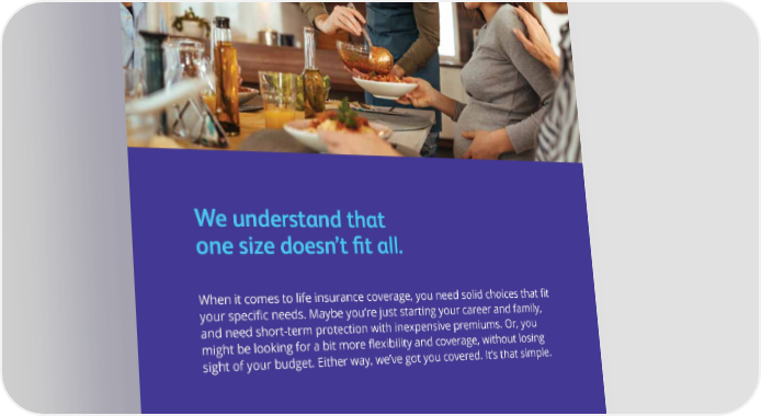 We understand that one size doesn’t 昀椀t all. When it comes to life insurance coverage, you need solid choices that 昀椀t your speci昀椀c needs. Maybe you’re just starting your career and family, and need short-term protection with inexpensive premiums. Or, you might be looking for a bit more 昀氀exibility and coverage, without losing sight of your budget. Either way, we’ve got you covered. It’s that simple.