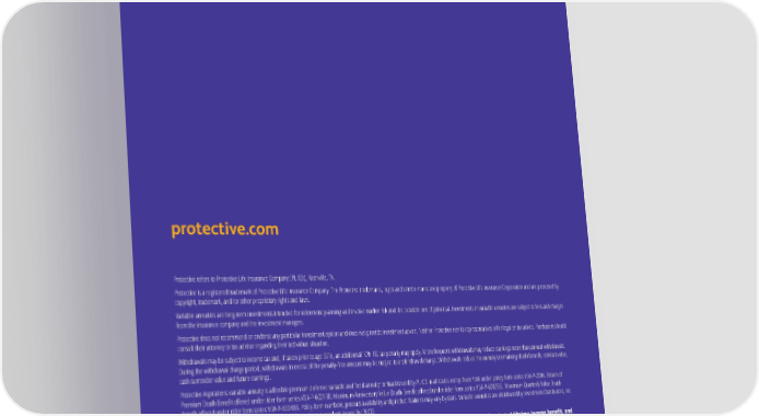 protective.com Protective refers to Protective Life Insurance Company (PLICO), Nashville, TN. Protective is a registered trademark of Protective Life Insurance Company. The Protective trademarks, logos and service marks are property of Protective Life Insurance Corporation and are protected by copyright, trademark, and/or other proprietary rights and laws. Variable annuities are long-term investments intended for retirement planning and involve market risk and the possible loss of principal. Investments in variable annuities are subject to fees and charges from the insurance company and the investment managers. Protective does not recommend or endorse any particular investment option and does not provide investment advice. Neither Protective nor its representatives o昀昀er legal or tax advice. Purchasers should consult their attorney or tax advisor regarding their individual situation. Withdrawals may be subject to income tax and, if taken prior to age 59½, an additional 10% IRS tax penalty may apply. More frequent withdrawals may reduce earnings more than annual withdrawals. During the withdrawal charge period, withdrawals in excess of the penalty-free amount may be subject to a withdrawal charge. Withdrawals reduce the annuity’s remaining death bene昀椀t, contract value, cash surrender value and future earnings. Protective Aspirations variable annuity is a 昀氀exible premium deferred variable and 昀椀xed annuity contract issued by PLICO in all states except New York under policy form series VDA-P-2006. Return of Premium Death Bene昀椀t o昀昀ered under rider form series VDA-P-6001BB. Maximum Anniversary Value Death Bene昀椀t o昀昀ered under rider form series VDA-P-6002BB. Maximum Quarterly Value Death Bene昀椀t o昀昀ered under rider form series VDA-P-6034BB. Policy form numbers, product availability and product features may vary by state. Variable annuities are distributed by Investment Distributors, Inc. (IDI), a broker-dealer and the principal underwriter for registered products issued by PLICO. Investors should carefully consider the investment objectives, risks, charges and expenses of a variable annuity, any optional protected lifetime income bene昀椀t, and the underlying investment options before investing. This and other information is contained in the prospectuses for a variable annuity and its underlying investment options. Investors should read the prospectuses carefully before investing. Prospectuses may be obtained by contacting PLICO at 800-456-6330. Not FDIC/NCUA Insured Not Bank or Credit Union Guaranteed Not a Deposit Not Insured By Any Federal Government Agency May Lose Value PAC.3384556 (12.21)