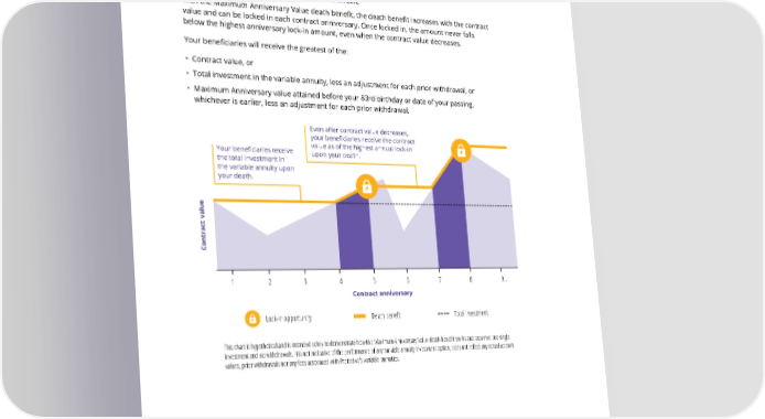Maximum Anniversary Value death bene昀椀t With the Maximum Anniversary Value death bene昀椀t, the death bene昀椀t increases with the contract value and can be locked in each contract anniversary. Once locked in, the amount never falls below the highest anniversary lock-in amount, even when the contract value decreases. Your bene昀椀ciaries will receive the greatest of the: • Contract value, or • Total investment in the variable annuity, less an adjustment for each prior withdrawal, or • Maximum Anniversary value attained before your 83rd birthday or date of your passing, whichever is earlier, less an adjustment for each prior withdrawal. Even after contract value decreases, your bene昀椀ciaries receive the contract value as of the highest annual lock-in Your bene昀椀ciaries receive upon your death. the total investment in the variable annuity upon your death. Contract value 1 2 3 4 5 6 7 8 9... Contract anniversary Lock-in opportunity Death bene昀椀t Total investment This chart is hypothetical and is intended solely to demonstrate how the Maximum Anniversary Value death bene昀椀t works and assumes one single investment and no withdrawals. It is not indicative of the performance of any variable annuity investment option, does not re昀氀ect any actual account values, prior withdrawals nor any fees associated with Protective's variable annuities. 3