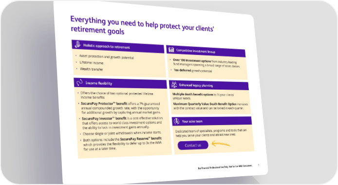 Everything you need to help protect your clients’ retirement goals Holistic approach to retirement Competitive investment lineup • Asset protection and growth potential • Over 100 investment options from industry leading • Lifetime income fund managers spanning a broad range of asset classes • Wealth transfer • Tax-deferred growth potential Income 昀氀exibility Enhanced legacy planning • O昀昀ers the choice of two optional protected lifetime Multiple death bene昀椀t options to 昀椀t your clients’ income bene昀椀ts unique needs. SM • SecurePay Protector bene昀椀t o昀昀ers a 7% guaranteed Maximum Quarterly Value Death Bene昀椀t Option increases annual compounded growth rate, with the opportunity with the contract value and can be locked in each quarter. for additional growth by capturing annual market gains. SM • SecurePay Investor bene昀椀t is a cost-e昀昀ective solution Your sales team that o昀昀ers access to world class investment options and the ability to lock in investment gains annually. • Choose single or joint withdrawals when income starts. Dedicated team of specialists, programs and tools that can SM help you serve your clients and attract new ones • Both options include the SecurePay Reserve bene昀椀t which provides the 昀氀exibility to defer up to 3x the AWA Contact us for use at a later time. For Financial Professional Use Only. Not for Use With Consumers. 3