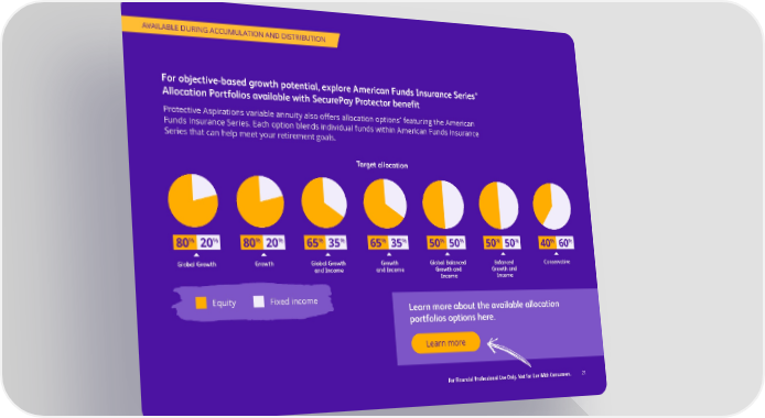AVAILABLE DURING ACCUMULATION AND DISTRIBUTION ® For objective-based growth potential, explore American Funds Insurance Series Allocation Portfolios available with SecurePay Protector benefit * Protective Aspirations variable annuity also offers allocation options featuring the American Funds Insurance Series. Each option blends individual funds within American Funds Insurance Series that can help meet your retirement goals. Target allocation % % % % % % % % % % % % % % 80 20 80 20 65 35 65 35 50 50 50 50 40 60 Global Growth Growth Global Growth Growth Global Balanced Balanced Conservative and Income and Income Growth and Growth and Income Income Equity Fixed income Learn more about the available allocation portfolios options here. Learn more For Financial Professional Use Only. Not for Use With Consumers. 21