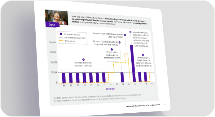 Jane, a 65-year-old female purchased a Protective Aspirations variable annuity and elects an optional protected lifetime income bene昀椀t. Here’s how she used the SecurePay Reserve feature to support her income needs in retirement: Jane 5 Jane needs a new roof. To Her reserve amount reaches the maximum value 4 pay the cost, she withdraws Actual amount withdrawn the full reserve amount (3X her AWA of $30,000). Annual withdrawal amount (AWA) and also takes her $10,000 She takes a $10,000 withdrawal to help 3 Reserve amount current year’s bene昀椀t for $40,000 her grandkids with college expenses. $40,000 total withdrawal. 2 She gains another $30,000 income source and 6 decides to defer her AWA. Her reserve amount is 1 depleted. She can start $20,000 Jane begins income with a taking her $10,000 annual withdrawals or defer funds. maximum $10,000 AWA. $10,000 $0 65 66 67 68 69 70 71 72 73 74 75 76 77 78 79… Jane’s age This chart is hypothetical and for illustrative use only. It is intended solely to demonstrate the SecurePay Reserve feature assuming a $10,000 bene昀椀t. The chart is not intended to forecast, imply or guaranteed performance of any investment. Actual performance may vary. For Financial Professional Use Only. Not for Use With Consumers. 31