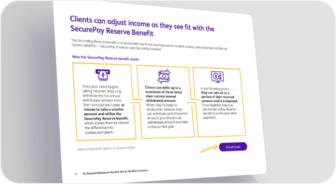 Clients can adjust income as they see fit with the SecurePay Reserve Benefit The SecurePay Reserve benefit is included with the Protective Aspirations variable annuity optional protected lifetime income benefits — SecurePay Protector and SecurePay Investor. How the SecurePay Reserve bene昀椀t works Once your client begins Clients can defer up to a In the following year(s), taking income*, they may maximum of three times they can take all or a withdraw the full annual their current annual portion of their reserved withdrawal amount from withdrawal amount. amount until it is depleted. their contract each year, or When they’re ready to Once depleted, they may choose to take a smaller access their balance, they use the SecurePay Reserve amount and utilize the can withdraw up to the entire bene昀椀t to continue to defer SecurePay Reserve bene昀椀t, amount, plus the annual payments. which allows them to rollover withdrawal amount available the di昀昀erence into in the current year. subsequent years. *Applies to income bene昀椀t payments, not contract annuitization. Download 30 For Financial Professional Use Only. Not for Use With Consumers.