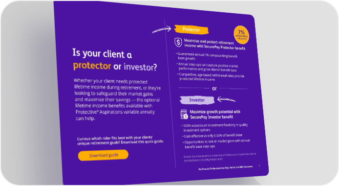 Protector 7% compounding roll-up rate Maximize and protect retirement income with SecurePay Protector benefit • Guaranteed annual 7% compounding bene昀椀t Is your client a base growth • Annual step-ups can capture positive market protector or investor? performance and grow clients’ bene昀椀t base • Competitive, age-based withdrawal rates provide protected lifetime income Whether your client needs protected or lifetime income during retirement, or they’re looking to safeguard their market gains Investor and maximize their savings — the optional lifetime income bene昀椀ts available with ® Maximize growth potential with Protective Aspirations variable annuity can help. SecurePay Investor benefit • 100% subaccount investment 昀氀exibility in quality investment options Curious which rider 昀椀ts best with your clients’ • Cost-e昀昀ective at only 0.50% of bene昀椀t base unique retirement goals? Download this quick guide. • Opportunities to lock in market gains with annual bene昀椀t base step-ups Download guide Allocation of purchase payments or contract value to the 昀椀xed account is not permitted under the SecurePay Investor or SecurePay Protector bene昀椀t. For Financial Professional Use Only. Not for Use With Consumers. 9