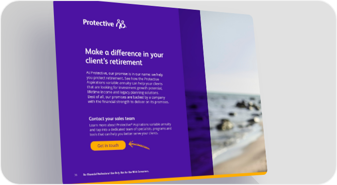 Make a di昀昀erence in your client’s retirement At Protective, our promise is in our name: we help you protect retirement. See how the Protective Aspirations variable annuity can help your clients that are looking for investment growth potential, lifetime income and legacy planning solutions. Best of all, our promises are backed by a company with the 昀椀nancial strength to deliver on its promises. Contact your sales team ® Learn more about Protective Aspirations variable annuity and tap into a dedicated team of specialists, programs and tools that can help you better serve your clients. Get in touch 36 For Financial Professional Use Only. Not for Use With Consumers.