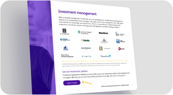 Investment management With a variable annuity from Protective, you can diversify your investments among several options from established fund managers. We select each fund manager for their high level of professional credentials and experience. They’re responsible for implementing each respective investment option’s strategy and managing its portfolio trading activities. Tax-free transfers among the various investment options may help maintain your preferred level of diversi昀椀cation. Certain limitations apply, so please see the product prospectus for more information. Diversi昀椀cation neither assures a pro昀椀t nor eliminates the risk of experiencing investment losses. See our investment options Protective Aspirations Variable Annuity o昀昀ers over 100 investment options from leading fund managers allowing you to build diversi昀椀ed portfolios that align with your clients’ goals. Learn more For Financial Professional Use Only. Not for Use With Consumers. 7