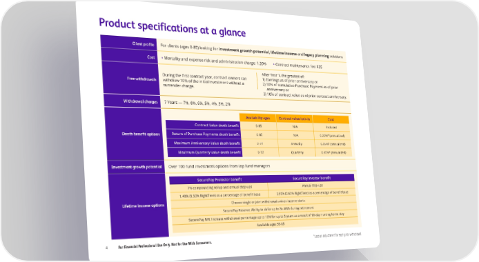 Product specifications at a glance Client pro昀椀le For clients (ages 0-85) looking for investment growth potential, lifetime income and legacy planning solutions Cost • Mortality and expense risk and administration charge: 1.20% • Contract maintenance fee: $35 After Year 1, the greatest of: During the 昀椀rst contract year, contract owners can 1) Earnings as of prior anniversary or Free withdrawals withdraw 10% of the initial investment without a 2) 10% of cumulative Purchase Payment as of prior surrender charge. anniversary or 3) 10% of contract value as of prior contract anniversary. Withdrawal charges 7 Years — 7%, 6%, 6%, 5%, 4%, 3%, 2% Availability ages Contract value lock-in Cost 0-85 N/A Included Contract Value death bene昀椀t 0-85 N/A 0.20%* (annualized) Death bene昀椀t options Return of Purchase Payments death bene昀椀t 0-77 Annually 0.35%* (annualized) Maximum Anniversary Value death bene昀椀t 0-77 Quarterly 0.40%* (annualized) Maximum Quarterly Value death bene昀椀t Investment growth potential Over 100 fund investment options from top fund managers SecurePay Protector bene昀椀t SecurePay Investor bene昀椀t 7% compounding rollup and annual step-ups Annual step-ups 1.40% (1.50% RightTime) as a percentage of bene昀椀t base 0.50% (0.60% RightTime) as a percentage of bene昀椀t base Lifetime income options Choose single or joint withdrawals when income starts SecurePay Reserve: Ability to defer up to 3x AWA during retirement SecurePay NH: Increase withdrawal percentage up to 10% for up to 5 years as a result of 90-day nursing home stay Available ages 55-85 4 For Financial Professional Use Only. Not for Use With Consumers. *Less an adjustment for each prior withdrawal.