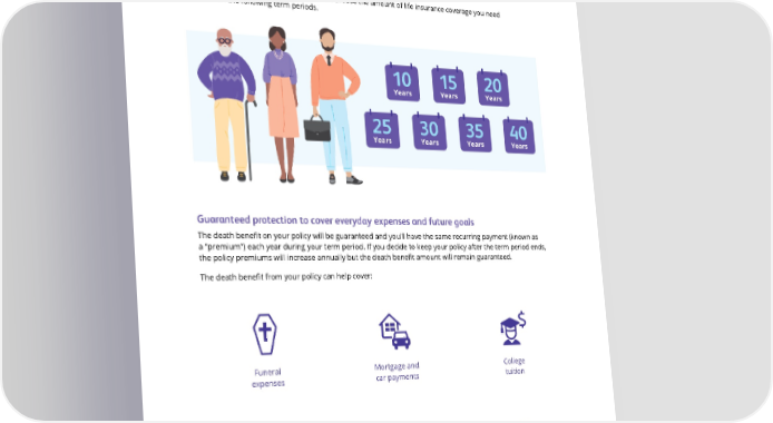 ® Protective Classic Choice term | How it works Term coverage that's just right for your life With Protective Classic Choice term, you can choose the amount of life insurance coverage you need from one of the following term periods. 10 15 20 Years Years Years 25 30 35 40 Years Years Years Years Guaranteed protection to cover everyday expenses and future goals The death bene昀椀t on your policy will be guaranteed and you’ll have the same recurring payment (known as a “premium”) each year during your term period. If you decide to keep your policy after the term period ends, the policy premiums will increase annually but the death bene昀椀t amount will remain guaranteed. The death bene昀椀t from your policy can help cover: Funeral Mortgage and College expenses car payments tuition Outstanding Household Weddings debts expenses 2