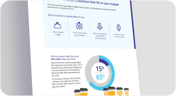 Term life insurance: Protection that 昀椀ts in your budget Term life insurance is generally a budget-friendly option that’s designed to provide death bene昀椀t protection for a set period of time. Term insurance is a good option if you: Have a limited Have a family with Want to supplement Have short-term budget young children an existing life 昀椀nancial needs insurance policy Life insurance might be more a昀昀ordable than you think One of the most common myths about life insurance is around the cost. 15% of consumers say they haven’t bought life % insurance because it’s too expensive, 15 and more than 65% overestimate its true cost. % For instance, a 30-year-old could buy 65 a 35-year term policy for less than $25 a month. That’s about 6 cups of 1 gourmet co昀昀ee. Protective Classic Choice term policy, 35-year guarantee, Preferred Non-Tobacco, $250,000 death bene昀椀t. Premiums increase annually after the initial guaranteed premium period. ¹ LIMRA and LIFE Foundation 2019 Insurance Barometer Study. 1