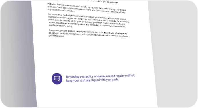 What happens next? If you decide that a Protective Indexed Choice UL policy is right for you, the application process begins. With your 昀椀nancial professional, you’ll start by signing some forms and answering a few medical questions. You’ll also complete the application and select your face amount (death bene昀椀t) and any optional bene昀椀ts or riders. In most cases, a medical professional will then contact you to schedule a life insurance physical examination, usually in your own home. Your application is then sent to Protective for underwriting, where, over the next few weeks, your application physical exam results are reviewed. Medical records or additional underwriting criteria may be required to determine your health risk and quali昀椀cation for the policy. If approved, you will receive a copy of your policy. Be sure to 昀椀le this with your other important documents, notify your bene昀椀ciaries and begin paying your premiums according to the schedule you established. Reviewing your policy and annual report regularly will help keep your strategy aligned with your goals. 9