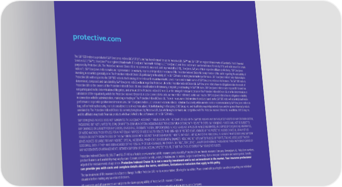 protective.com ® ® The S&P 500 Index is a product of S&P Dow Jones Indices LLC (“SPDJI”), and has been licensed for use by Protective Life. S&P and S&P 500 are registered trademarks of Standard & Poor’s Financial ® Services LLC (“S&P”); Dow Jones is a registered trademark of Dow Jones Trademark Holdings LLC (“Dow Jones”); and these trademarks have been licensed for use by SPDJI and sublicensed for certain purposes by Protective Life. The Protective Indexed Choice UL is not sponsored, endorsed, sold or promoted by SPDJI, Dow Jones, S&P, any of their respective a昀케liates (collectively, “S&P Dow Jones Indices”). S&P Dow Jones Indices makes no representation or warranty, express or implied, to the owners of the Protective Indexed Choice UL or any member of the public regarding the advisability of investing in securities generally or in The Protective Indexed Choice UL particularly or the ability of the S&P 500 Index to track general market performance. S&P Dow Jones Indices’ only relationship to Protective Life with respect to the S&P 500 Index is the licensing of the Index and certain trademarks, service marks and/or trade names of S&P Dow Jones Indices or its licensors. The S&P 500 Index is determined, composed and calculated by S&P Dow Jones Indices without regard to Protective Life or the Protective Indexed Choice UL. S&P Dow Jones Indices have no obligation to take the needs of Protective Life or the owners of the Protective Indexed Choice UL into consideration in determining, composing or calculating the S&P 500 Index. S&P Dow Jones Indices is not responsible for and has not participated in the determination of the prices, and amount of the Protective Indexed Choice UL or the timing of the issuance or sale of the Protective Indexed Choice UL or in the determination or calculation of the equation by which the Protective Indexed Choice UL is to be converted into cash, surrendered or redeemed, as the case may be. S&P Dow Jones Indices has no obligation or liability in connection with the administration, marketing or trading of The Protective Indexed Choice UL. There is no assurance that investment products based on the S&P 500 Index will accurately track index performance or provide positive investment returns. S&P Dow Jones Indices LLC is not an investment advisor. Inclusion of a security within an index is not a recommendation by S&P Dow Jones Indices to buy, sell or hold such security, nor is it considered to be investment advice. Notwithstanding the foregoing, CME Group Inc. and its a昀케liates may independently issue and/or sponsor 昀椀nancial products unrelated to The Protective Indexed Choice UL currently being issued by Protective Life, but which may be similar to and competitive with The Protective Indexed Choice UL. In addition, CME Group Inc. and its a昀케liates may trade 昀椀nancial products which are linked to the performance of the S&P 500 Index. S&P DOW JONES INDICES DOES NOT GUARANTEE THE ADEQUACY, ACCURACY, TIMELINESS AND/OR THE COMPLETENESS OF THE S&P 500 INDEX OR ANY DATA RELATED THERETO OR ANY COMMUNICATION, INCLUDING BUT NOT LIMITED TO, ORAL OR WRITTEN COMMUNICATION (INCLUDING ELECTRONIC COMMUNICATIONS) WITH RESPECT THERETO. S&P DOW JONES INDICES SHALL NOT BE SUBJECT TO ANY DAMAGES OR LIABILITY FOR ANY ERRORS, OMISSIONS, OR DELAYS THEREIN. S&P DOW JONES INDICES MAKES NO EXPRESS OR IMPLIED WARRANTIES, AND EXPRESSLY DISCLAIMS ALL WARRANTIES, OF MERCHANTABILITY OR FITNESS FOR A PARTICULAR PURPOSE OR USE OR AS TO RESULTS TO BE OBTAINED BY PROTECTIVE LIFE, OWNERS OF THE PROTECTIVE INDEXED CHOICE UL, OR ANY OTHER PERSON OR ENTITY FROM THE USE OF THE S&P 500 INDEX OR WITH RESPECT TO ANY DATA RELATED THERETO. WITHOUT LIMITING ANY OF THE FOREGOING, IN NO EVENT WHATSOEVER SHALL S&P DOW JONES INDICES BE LIABLE FOR ANY INDIRECT, SPECIAL, INCIDENTAL, PUNITIVE OR CONSEQUENTIAL DAMAGES INCLUDING BUT NOT LIMITED TO, LOSS OF PROFITS, TRADING LOSSES, LOST TIME OR GOODWILL, EVEN IF THEY HAVE BEEN ADVISED OF THE POSSIBILITY OF SUCH DAMAGES, WHETHER IN CONTRACT, TORT, STRICT LIABILITY OR OTHERWISE. THERE ARE NO THIRD-PARTY BENEFICIARIES OF ANY AGREEMENTS OR ARRANGEMENTS BETWEEN S&P DOW JONES INDICES AND PROTECTIVE LIFE, OTHER THAN THE LICENSORS OF S&P DOW JONES INDICES. Protective Indexed Choice UL (UL-27 and UL-27-NY) is a 昀氀exible premium universal life insurance policy issued by Protective Life and Annuity Insurance Company, Birmingham, AL. Policy form numbers, product features and availability may vary by state. Consult policies for bene昀椀ts, riders, limitations and exclusions. Subject to underwriting. Up to a two-year contestable and suicide period. Bene昀椀ts adjusted for misstatements of age or sex. Protective Indexed Choice UL is not a security investment and is not an investment in the market. Your insurance professional can provide you with costs and complete details about the terms, conditions, limitations or exclusions that apply to this policy. The tax treatment of life insurance is subject to change. Neither Protective Life nor its representatives o昀昀er legal or tax advice. Please consult with your legal or tax advisor regarding your individual situation before making any tax-related decisions. All payments and all guarantees are subject to the claims-paying ability of Protective Life Insurance Company. Protective is a registered trademark of PLICO and Indexed Choice is a trademark of Protective Life and Annuity Insurance Company. The Protective trademarks, logos and service marks are property of PILCO and are protected by copyright, trademark, and/or other proprietary rights and laws. CLC.9359 (06.23)