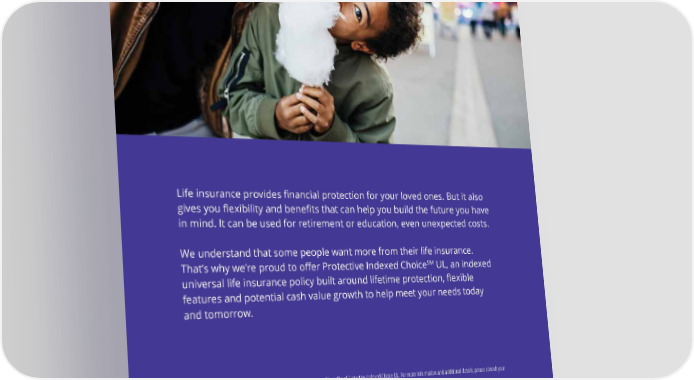 Life insurance provides 昀椀nancial protection for your loved ones. But it also gives you 昀氀exibility and bene昀椀ts that can help you build the future you have in mind. It can be used for retirement or education, even unexpected costs. We understand that some people want more from their life insurance. SM UL, an indexed That’s why we’re proud to o昀昀er Protective Indexed Choice universal life insurance policy built around lifetime protection, 昀氀exible features and potential cash value growth to help meet your needs today and tomorrow. This brochure is intended to provide an overview of the key features and bene昀椀ts of Protective Indexed Choice UL. For more information and additional details, please consult your illustration and policy.