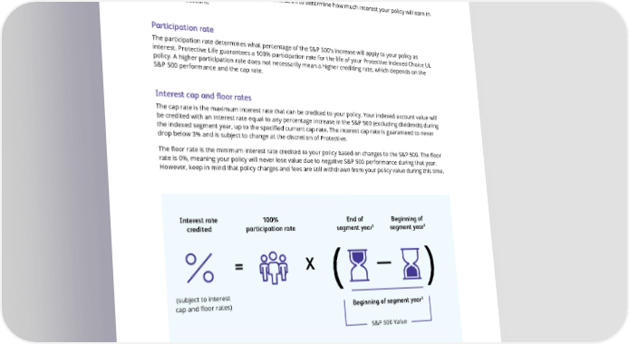 Protective Indexed ChoiceSM UL | Product guide How the indexed account works Protective Indexed Choice UL uses a simple calculation to determine how much interest your policy will earn in the indexed account. Participation rate The participation rate determines what percentage of the S&P 500’s increase will apply to your policy as interest. Protective Life guarantees a 100% participation rate for the life of your Protective Indexed Choice UL policy. A higher participation rate does not necessarily mean a higher crediting rate, which depends on the S&P 500 performance and the cap rate. Interest cap and 昀氀oor rates The cap rate is the maximum interest rate that can be credited to your policy. Your indexed account value will be credited with an interest rate equal to any percentage increase in the S&P 500 (excluding dividends) during the indexed segment year, up to the speci昀椀ed current cap rate. The interest cap rate is guaranteed to never drop below 3% and is subject to change at the discretion of Protective. The 昀氀oor rate is the minimum interest rate credited to your policy based on changes to the S&P 500. The 昀氀oor rate is 0%, meaning your policy will never lose value due to negative S&P 500 performance during that year. However, keep in mind that policy charges and fees are still withdrawn from your policy value during this time. Interest rate 100% End of Beginning of credited participation rate segment year3 segment year3 = X — (subject to interest 3 cap and 昀氀oor rates) Beginning of segment year S&P 500 Value 3 Excluding dividends 4