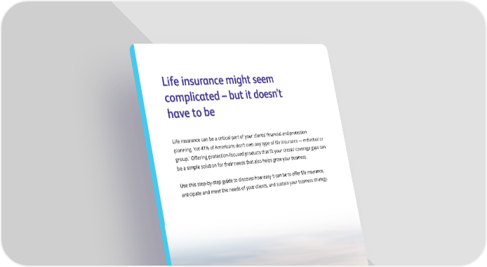 Life insurance might seem complicated – but it doesn’t have to be Life insurance can be a critical part of your clients’ financial and protection planning. Yet 41% of Americans don’t own any type of life insurance — individual or 1 group. Offering protection-focused products that fit your clients’ coverage gaps can be a simple solution for their needs that also helps grow your business. Use this step-by-step guide to discover how easy it can be to offer life insurance, anticipate and meet the needs of your clients, and sustain your business strategy. For Financial Professional Use Only. Not for Use With Consumers.