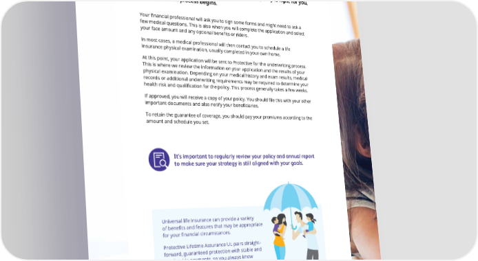 ® Protective Lifetime Assurance UL | What happens next? What happens next? If you decide a Protective Lifetime Assurance UL policy is right for you, the application process begins. Your 昀椀nancial professional will ask you to sign some forms and might need to ask a few medical questions. This is also when you will complete the application and select your face amount and any optional bene昀椀ts or riders. In most cases, a medical professional will then contact you to schedule a life insurance physical examination, usually completed in your own home. At this point, your application will be sent to Protective for the underwriting process. This is where we review the information on your application and the results of your physical examination. Depending on your medical history and exam results, medical records or additional underwriting requirements may be required to determine your health risk and quali昀椀cation for the policy. This process generally takes a few weeks. If approved, you will receive a copy of your policy. You should 昀椀le this with your other important documents and also notify your bene昀椀ciaries. To retain the guarantee of coverage, you should pay your premiums according to the amount and schedule you set. It's important to regularly review your policy and annual report to make sure your strategy is still aligned with your goals. Universal life insurance can provide a variety of bene昀椀ts and features that may be appropriate for your 昀椀nancial circumstances. Protective Lifetime Assurance UL pairs straight- forward, guaranteed protection with stable and predictable payments, so you always know what to expect out of your policy. 4