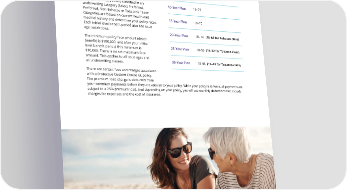 About Protective Custom Choice UL When you apply for a Protective Custom Choice UL policy, you are classi昀椀ed in an 10-Year Plan 18–75 underwriting category (Select Preferred, Preferred, Non-Tobacco or Tobacco). These categories are based on current health and 15-Year Plan 18–70 medical history and determine your policy rates. Each initial level bene昀椀t period also has issue age restrictions. 20-Year Plan 18– 65 (18–63 for Tobacco class) The minimum policy face amount (death bene昀椀t) is $100,000, and after your initial 25-Year Plan level bene昀椀t period, this minimum is 18–55 (18–52 for Tobacco class) $10,000. There is no set maximum face amount. This applies to all issue ages and 30-Year Plan 18–55 (18–43 for Tobacco class) all underwriting classes. There are certain fees and charges associated with a Protective Custom Choice UL policy. The premium load charge is deducted from your premium payments before they are applied to your policy. While your policy is in force, all payments are subject to a 25% premium load. And depending on your policy, you will see monthly deductions that include charges for expenses and the cost of insurance. 3