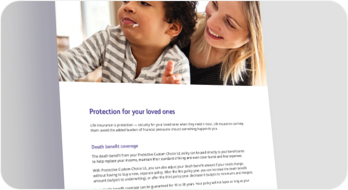 Protection for your loved ones Life insurance is protection — security for your loved ones when they need it most. Life insurance can help them avoid the added burden of 昀椀nancial pressures should something happen to you. Death bene昀椀t coverage The death bene昀椀t from your Protective Custom Choice UL policy can be paid directly to your bene昀椀ciaries to help replace your income, maintain their standard of living and even cover burial and 昀椀nal expenses. With Protective Custom Choice UL, you can also adjust your death bene昀椀t amount if your needs change, without having to buy a new, separate policy. After the 昀椀rst policy year, you can increase the death bene昀椀t amount (subject to underwriting), or after the third policy year, decrease it (subject to minimums and charges). Your death bene昀椀t coverage can be guaranteed for 10 to 30 years. Your policy will not lapse as long as your 1 planned premiums are paid. 1 Lapse protection guarantees the policy death bene昀椀t for the duration of the guarantee and does not cover cash or surrender value. Loans, withdrawals and other policy and premium changes will a昀昀ect the cost and length of protection. Failure to make premium payments as planned may cause the policy to lose lapse protection and premiums required to restore it could be signi昀椀cantly higher. Refer to the policy and endorsements for complete terms, conditions and limitations. 1